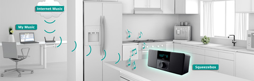 ![]() | ![]() | Want to play the same Latin station from Rio throughout the house? Or are you in the mood to mix it up with a different playlist in every room? Simple. Just add Squeezebox radios to any rooms you want to fill with music. You can play them independently or (to quote Sting) all together in perfect synchronicity. (Whole home control requires Squeezebox Controller) |